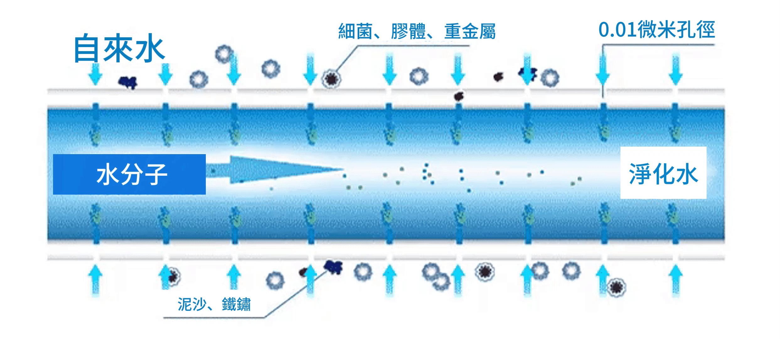 0.0001微米超微小孔徑,透過逆滲透原理,將水中所含不純物質與純水隔離,如熱原濾過性病毒、細菌、毒素化合物、重金屬、鹽類、游離子、等…危害人體健康的物質隔離,製造出純淨的飲用水。